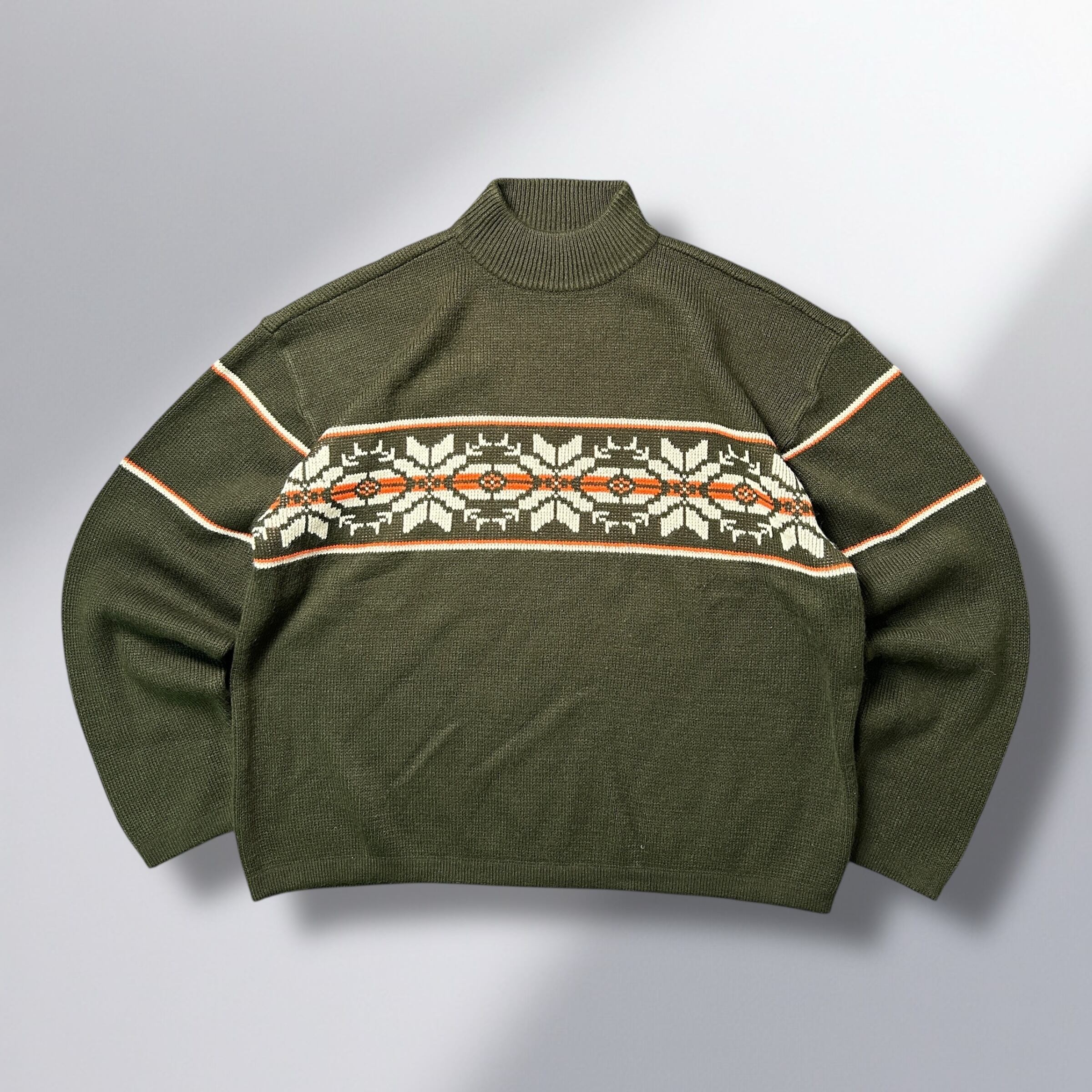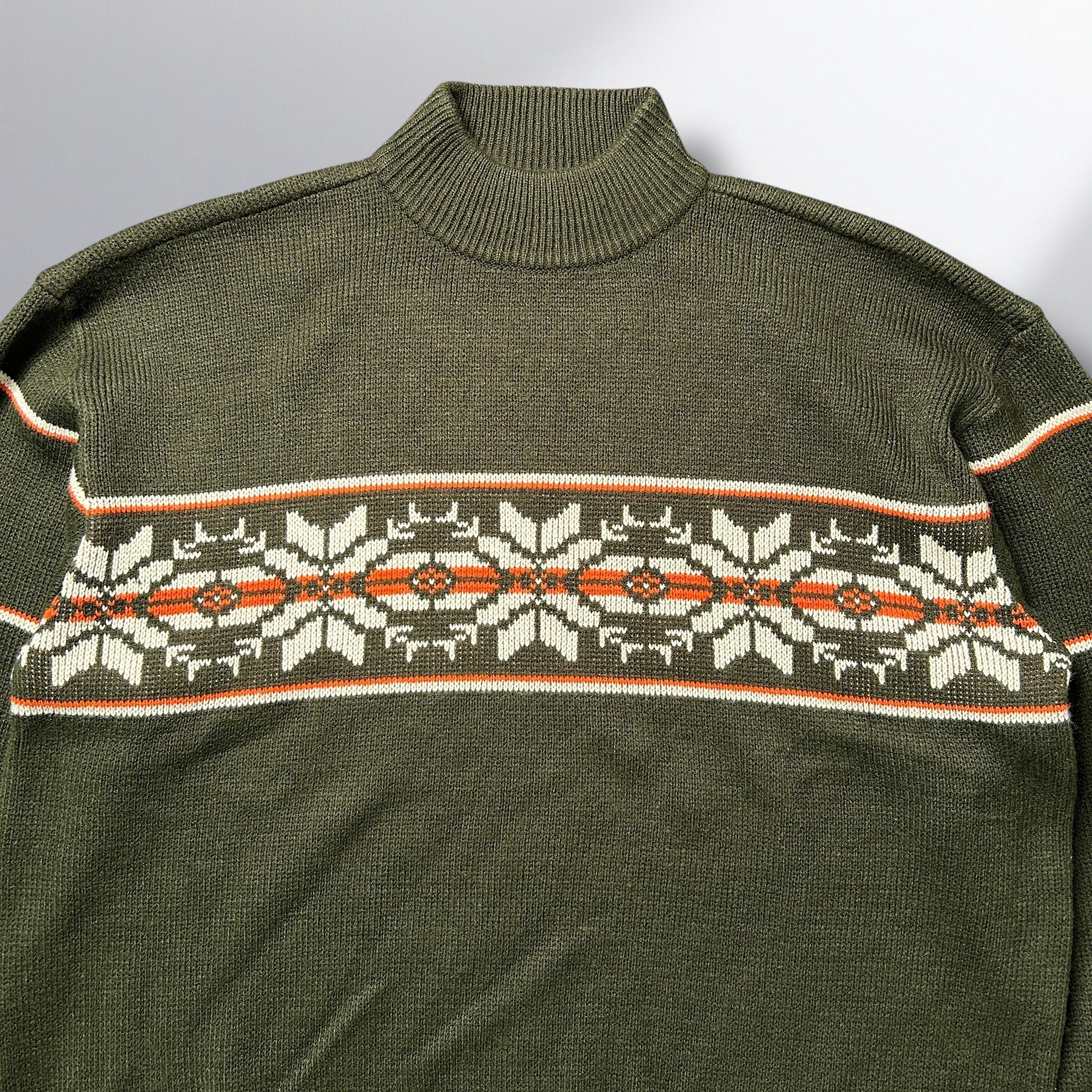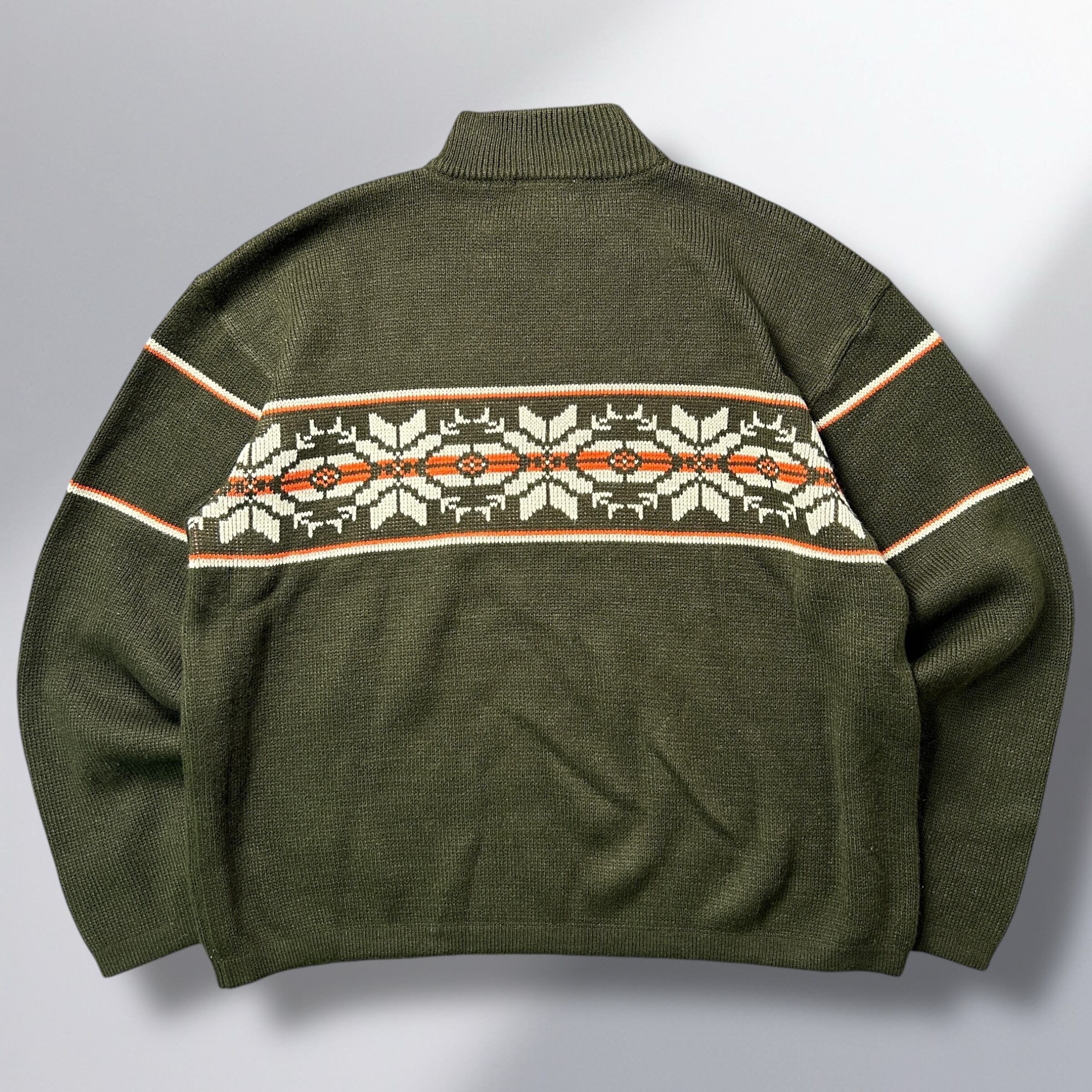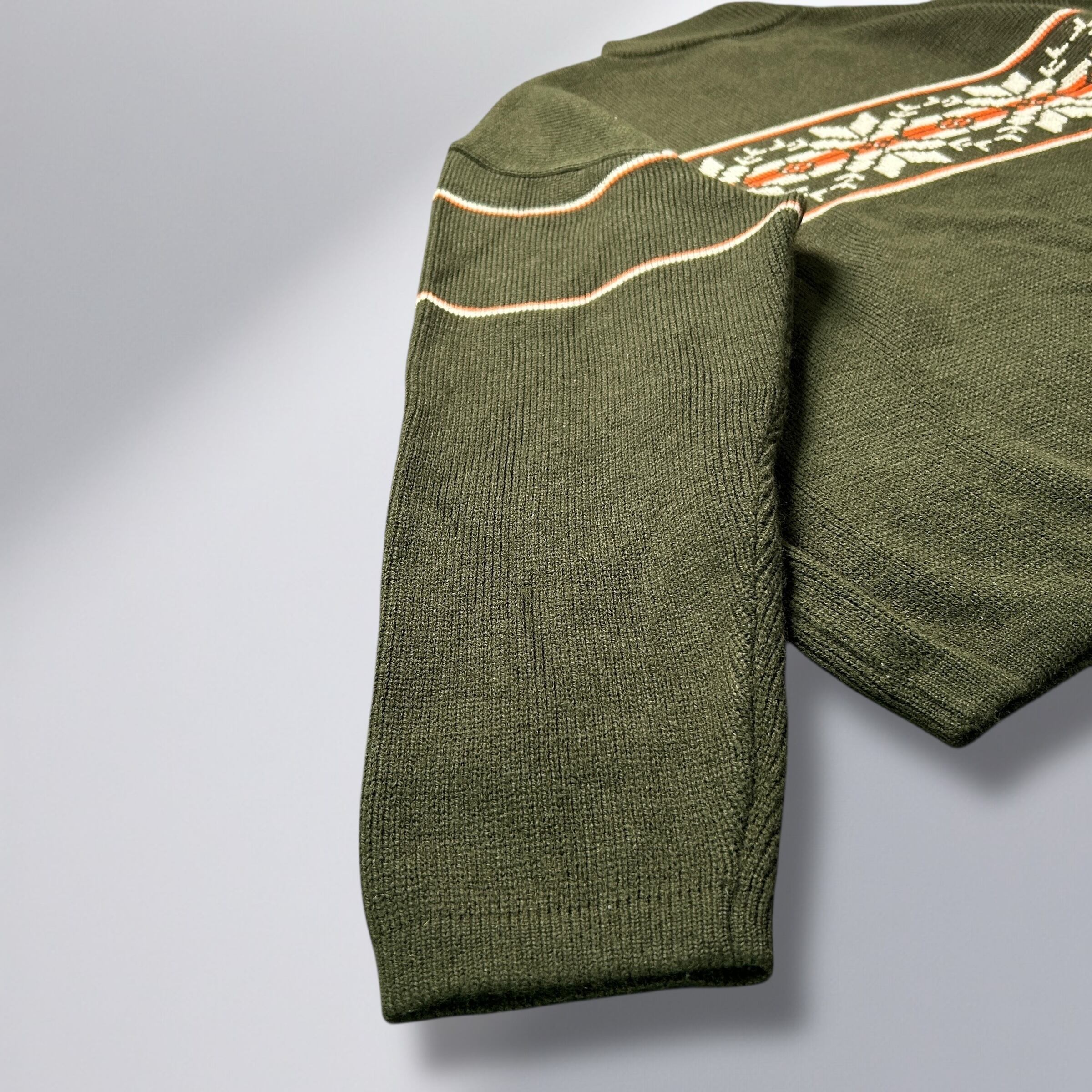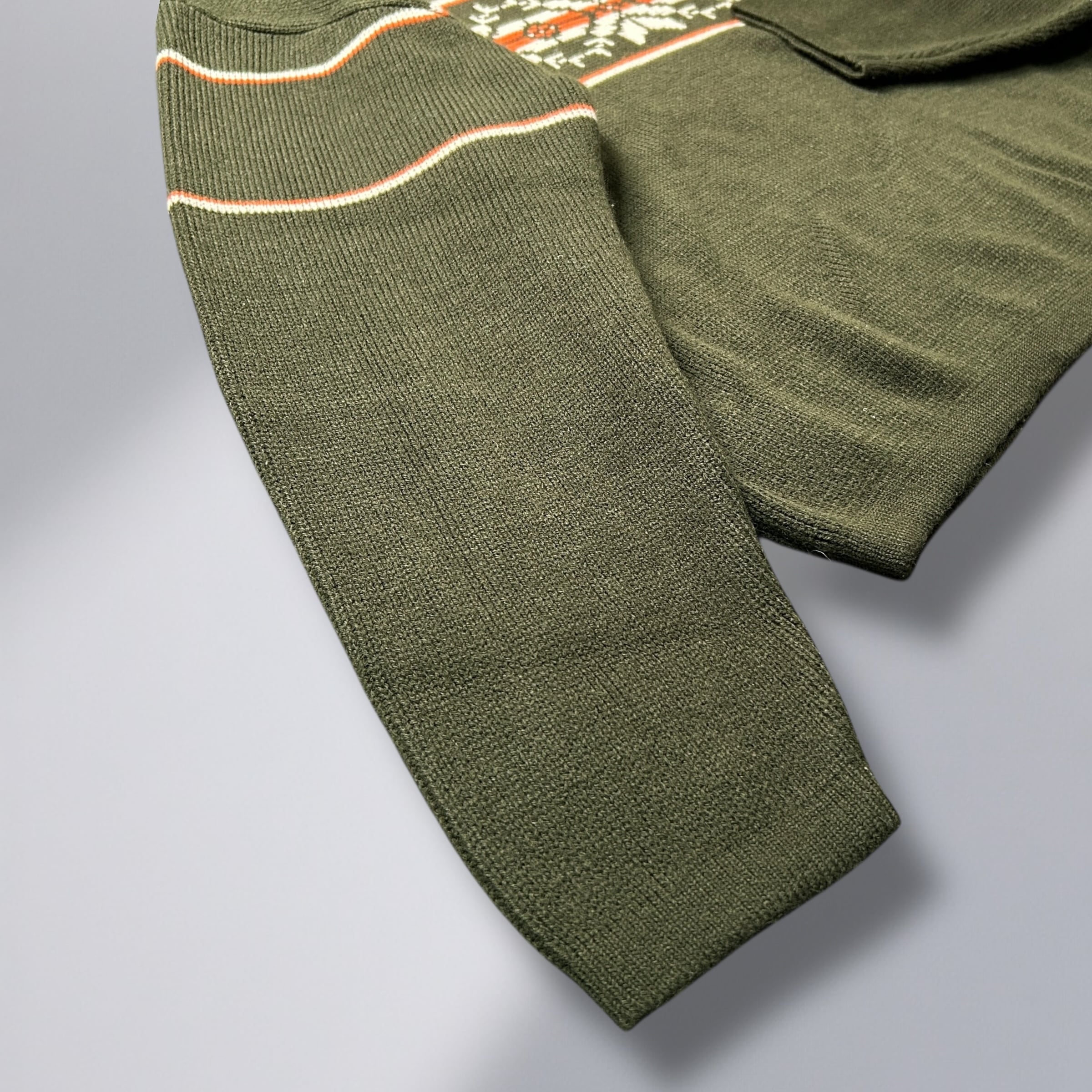 オリーブグリーンにオレンジ×アイボリーのノルディック柄がクラシック感を感じさせる1着