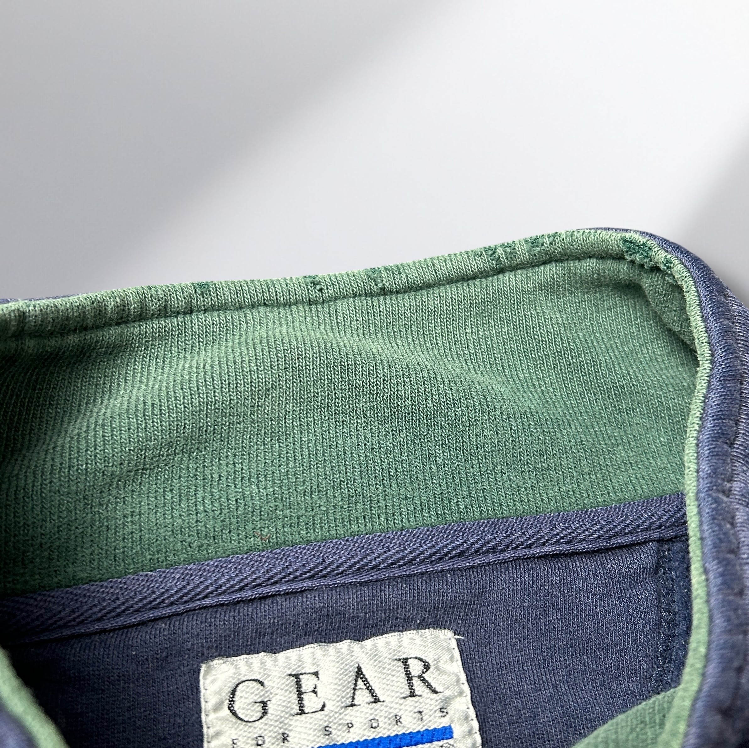襟がボタン仕様かつ、襟裏がグリーンの切り替えカラー+ポケット付き
