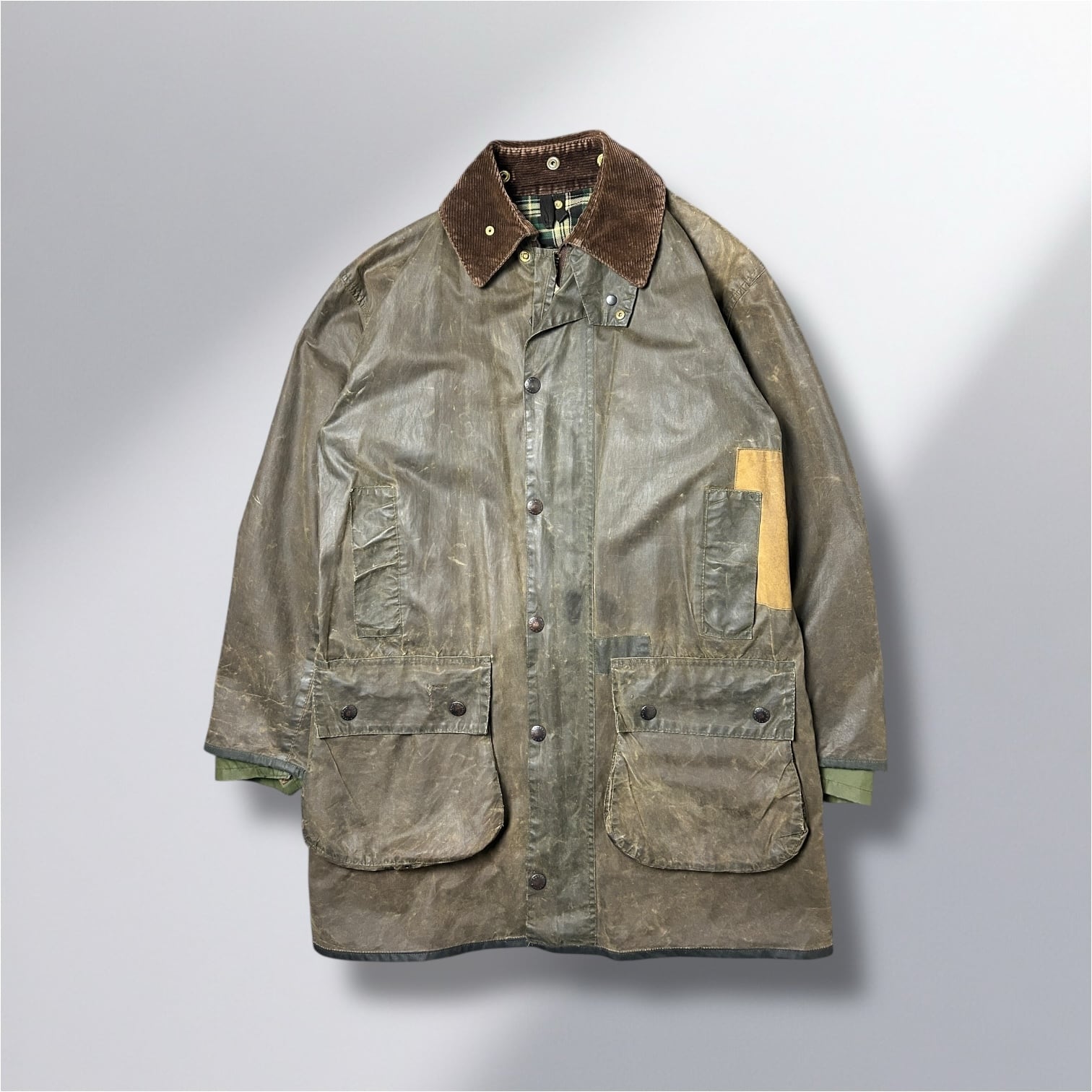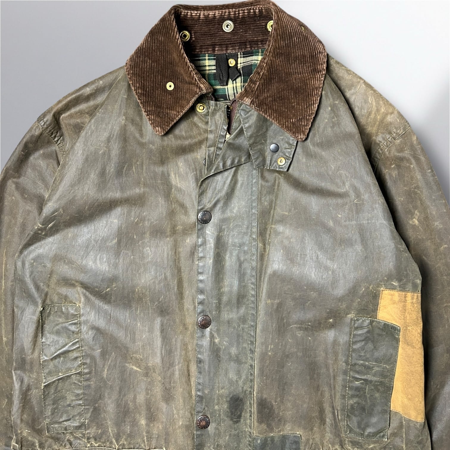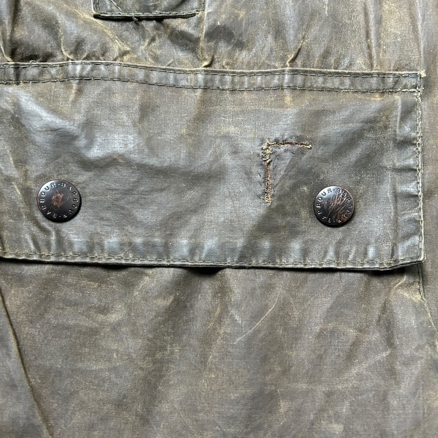 オイルドジャケット特有の使用感と修復痕あり。