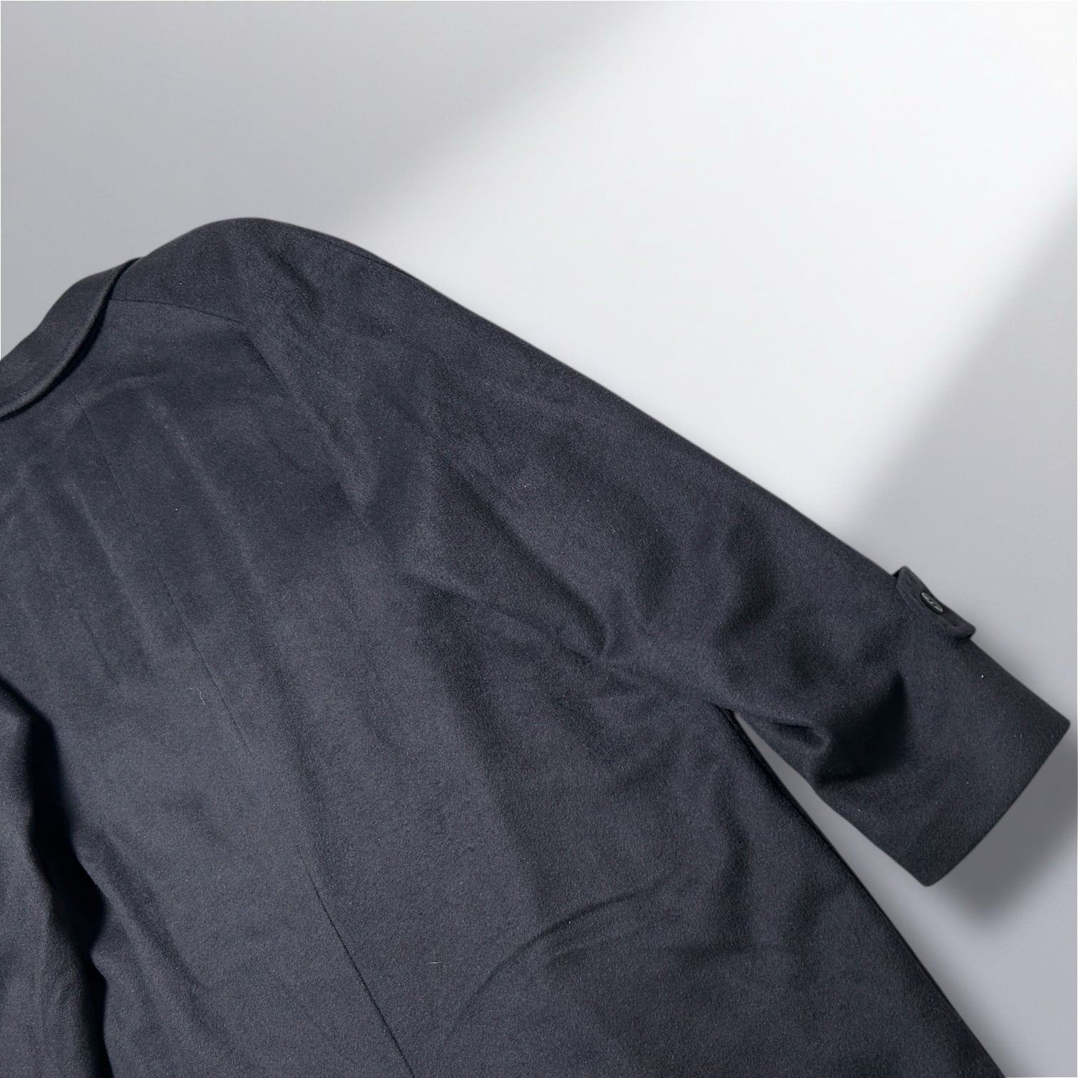すっきりとしたたたづまいと、落ち着いたネイビーの色合いが印象的なロングコート。